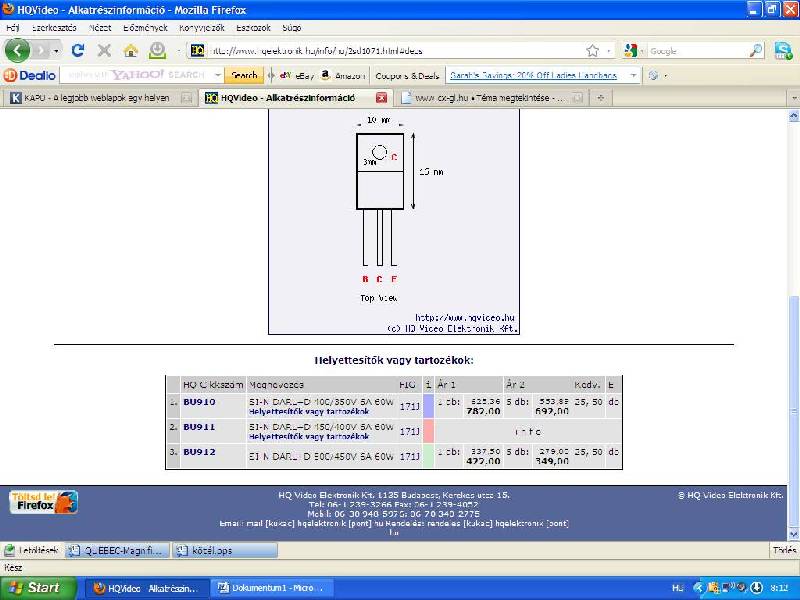 Köszi,én is néztem ezeket, de nem tud 10 Ampert, mint a gyári. Nekem a hasonló BU810 helyettesítő tranyó ment el benne, mert már ez is javítva volt. Ezért próbálkozom az eredeti 2SD1071-et beszerezni.