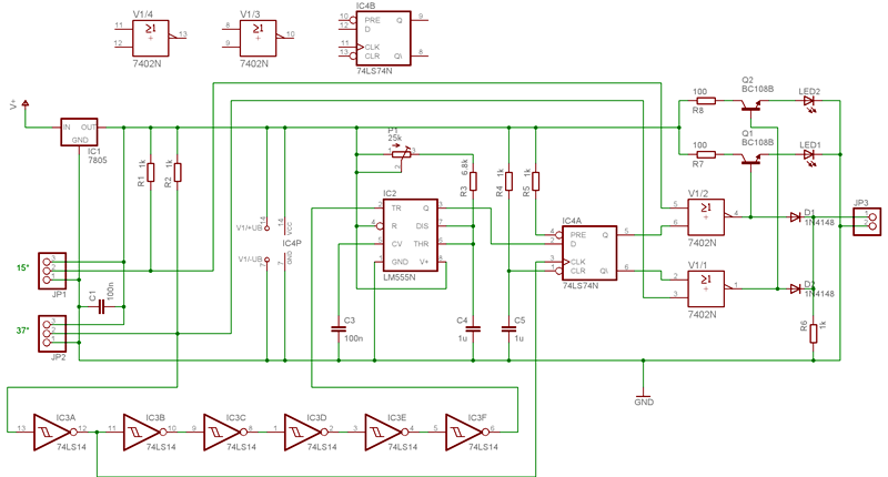 D tároló kimenetén pedig össze van kapuzva a vezérlés és a D ben tárolt érték, van 2 extra led ami indikálja, hogy melyik jeladóval megy a gyújtás.
