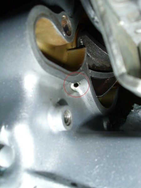 Erről a "túlfolyó" biztonsági furatról beszéltem, ami a szimmering és a tömszelence közé mutat. És azt a célt hivatott szolgálni, hogy a hibás tömszelence esetén a hűtőfolyadék nem a szimmeringet eszi, és végül az olajban köt ki, hanem a blokk oldalán csordogálva jelzi neked, hogy öcsi cseréljé' már ki